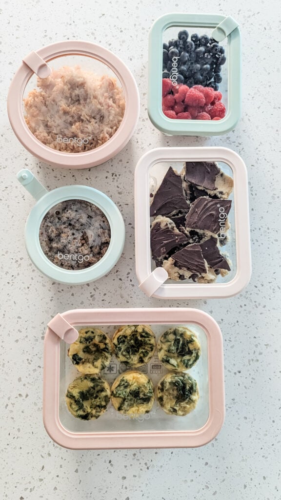 - baked oatmeal cups, cottage cheese egg bites, banana chocolate muffins, broccoli & cheese egg bites, mini blueberry muffins, sausage & cheese egg muffins, no-bake chocolate oat bars & mini turkey meatloaves